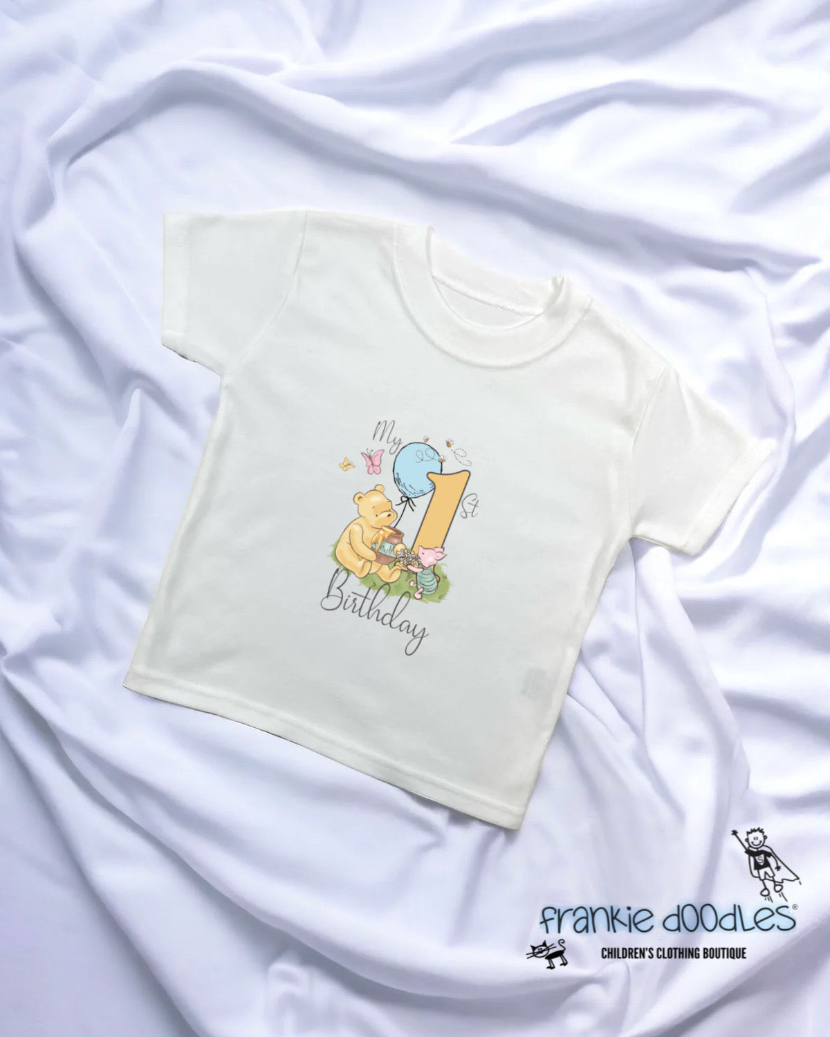 Mark your baby boy’s first birthday with this adorable 1st Birthday T-Shirt from Frankie Doodles. Featuring a cheerful bear, birthday cake, and a bright blue balloon, this custom-printed tee is a perfect blend of comfort and cuteness.